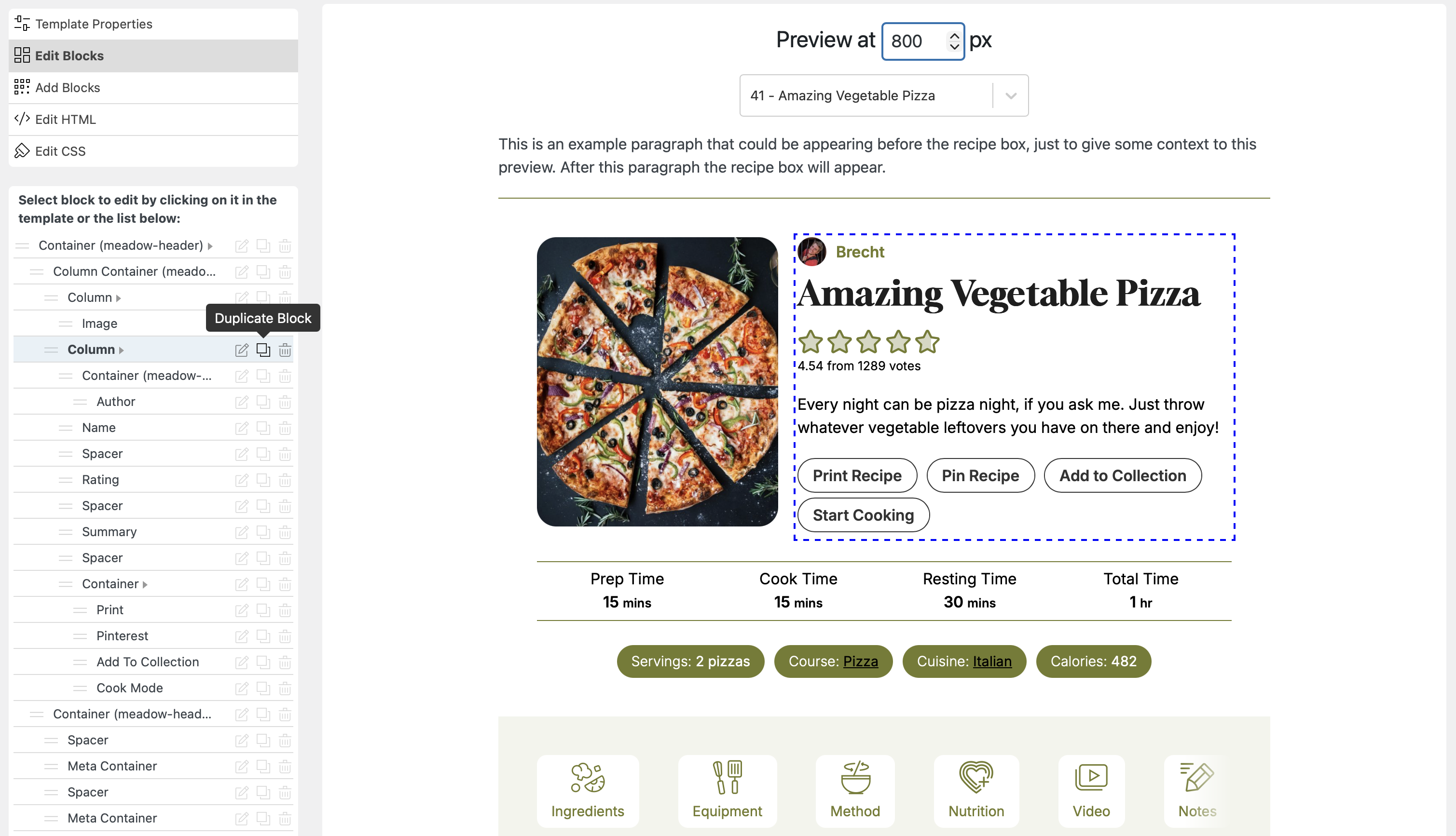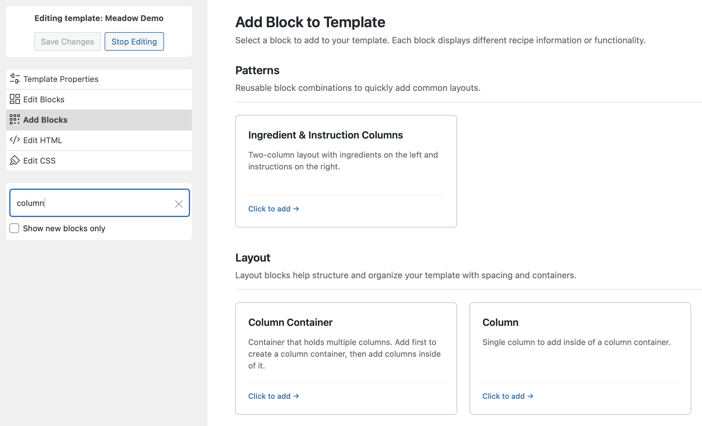 The Template Editor has been upgraded to make customizing your recipe templates faster and more intuitive. We’ve introduced a new “Add Blocks” interface which has more information about the block you’re about to add and includes search functionality to easily find the block you’re looking for.