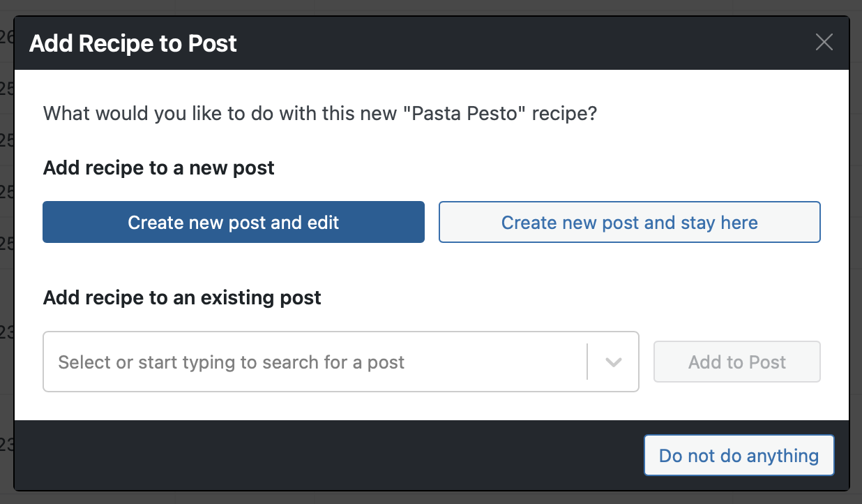 After creating a new recipe through the Dashboard or Manage page, a new modal will pop up allowing you to easily add this recipe to a new or existing post.
