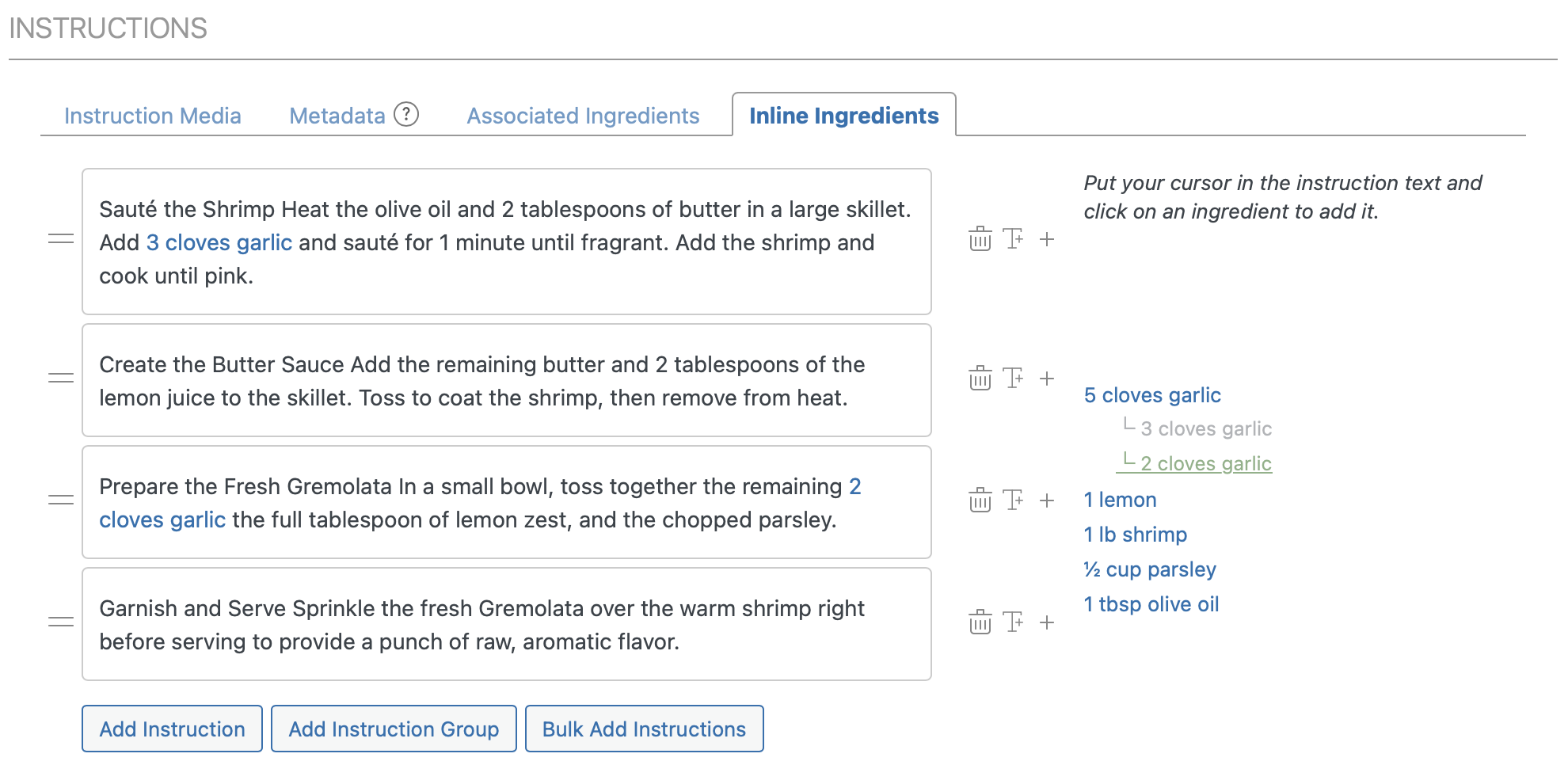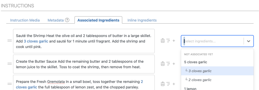 Similarly, you can associate the different split parts with instruction steps, if you prefer associated ingredients over inline ingredients.