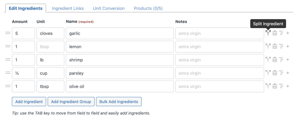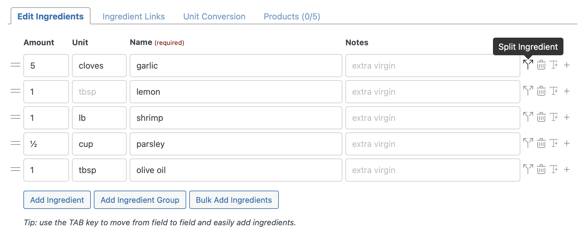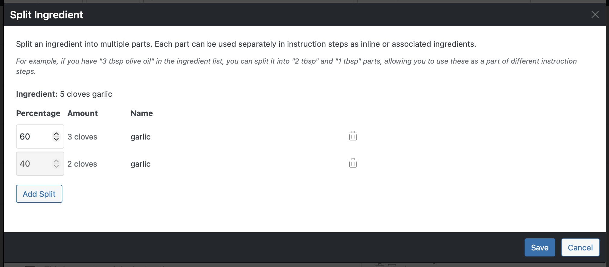 In the example above we split the “5 cloves garlic” that is in the ingredient list into a 60% and 40% part. The preview shows that this means 3 cloves for one step and 2 cloves for the other.