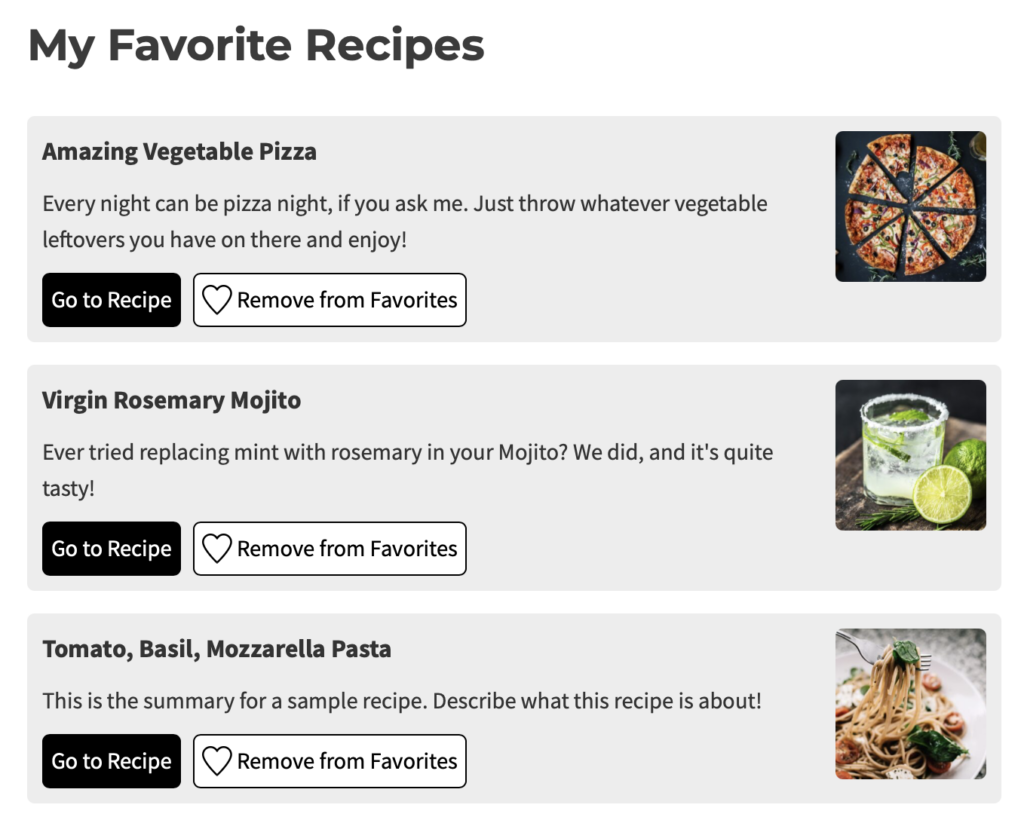 Once added to the list, they can view all their favorites in one place using the new Favorite Recipes List block or shortcode. Like this example Favorite Recipes page on our demo site.