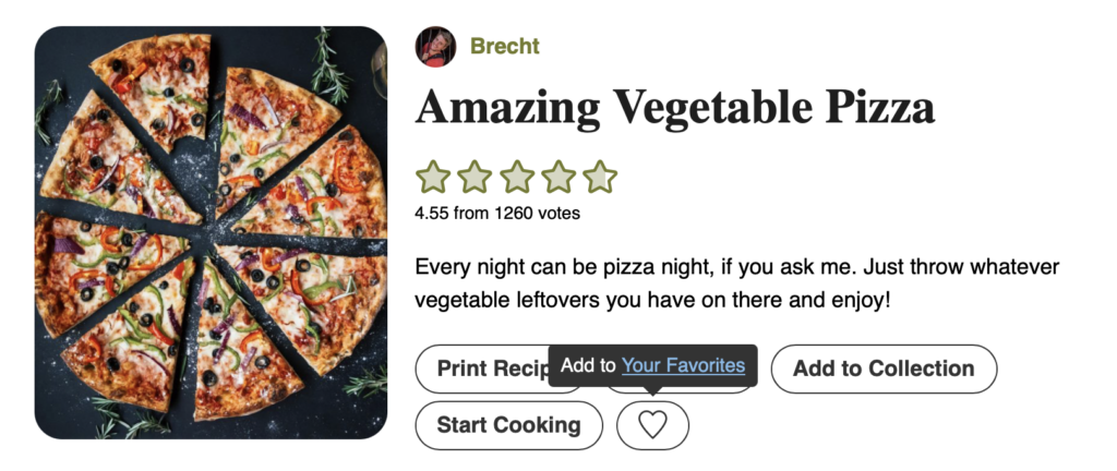 This is a great feature for sites that do not need the full Recipe Collections or Quick Access Shopping List experience and just want their visitors to be able to have a list of their favorite recipes. If you do want visitors to be able to generate a shopping list as well, those other features are worth looking at!