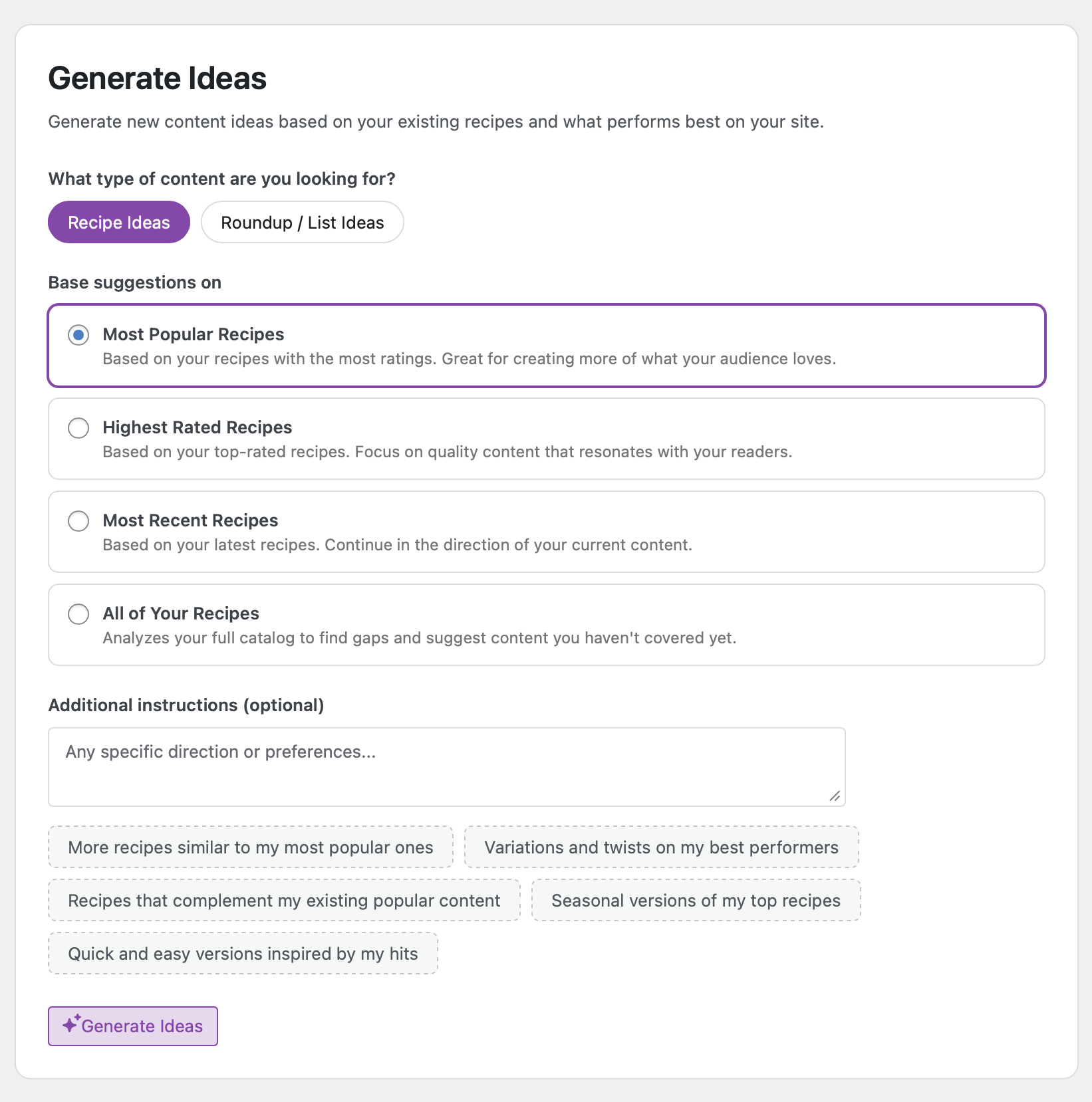 Stuck on what to publish next? The new idea generator helps you brainstorm new recipe ideas and list ideas (like roundups or meal plans) directly from the Manage page. It’s a great way to keep your content pipeline flowing without leaving your WordPress dashboard.