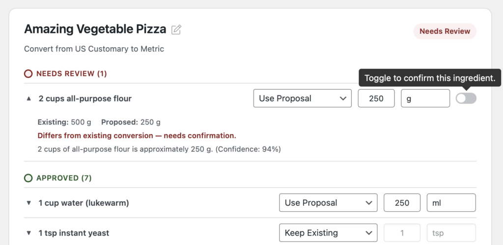 Similarly, if you’re offering metric and US customary unit conversions, AI can now review those conversions for accuracy. It’s an extra safety net to make sure your readers get the right amounts, no matter which unit system they prefer. Also great for adding a unit system to all of your recipes in bulk!